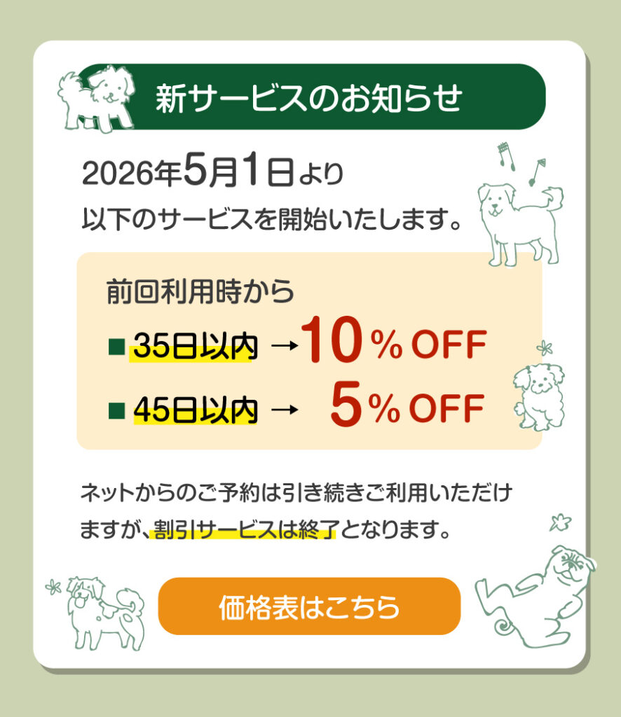 トリミングカフェ・リック/トップページ 2026.04.04 当園併設の『犬の保育園Hana』との同日でのご利用で、合計金額から10%割引きを3月よりスタートします! 詳しくはこちら lic0614 福岡市東区筥松にあるトリミングハウスです♪美容・ホテルご予約受付中‼︎ Instagram でフォロー 営業日カレンダー お知らせ・イベント 2025年2月18日 LIC、Hana同日利用で10%OFF! 2025年1月13日 犬の保育園Hana お正月キャンペーンのお知らせ 2024年12月10日 お客様ワンコフォト、クリスマスバージョンへ♪ 2024年12月2日 犬の保育園Hana クリスマスキャンペーンのお知らせ 2024年11月2日 店休日・イベントカレンダーを更新しました